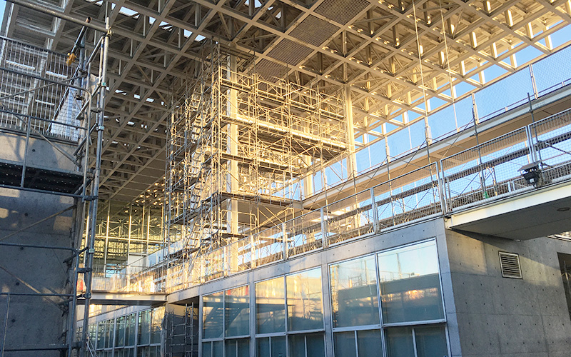 学生会館の内部天井はひときわ高く、足場を組むときは十分注意しました。